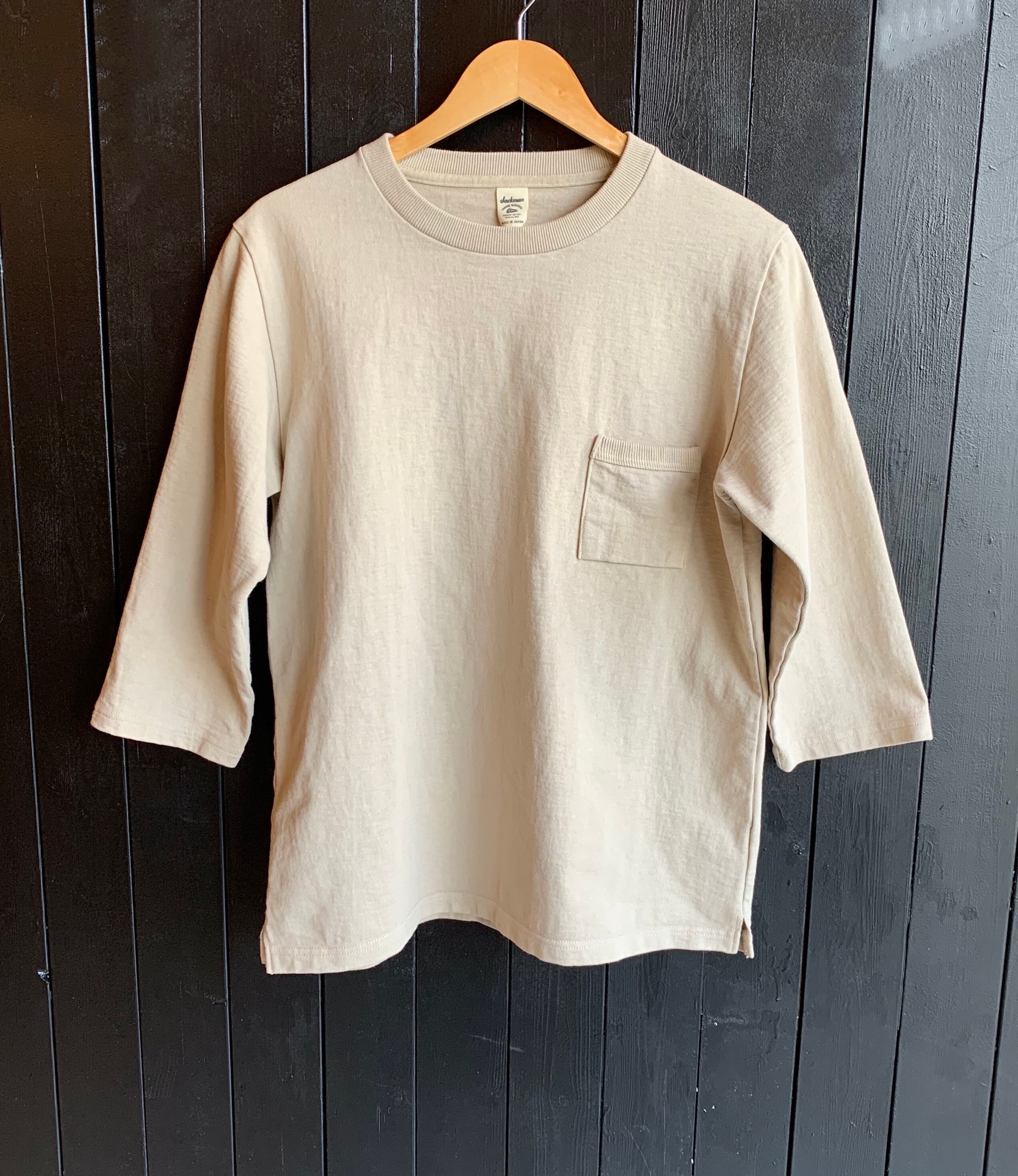 Jackman吊り編み機で編立て、極限まで度詰めした生地を使用したスウェットのような5分袖Tシャツ。耐久性のあるしっかりした生地で、表面の凹凸感も特徴的です。ポケットは手の込んだマチ付き仕様で、縁は伸縮性のあるリブバインダーで補強されています。